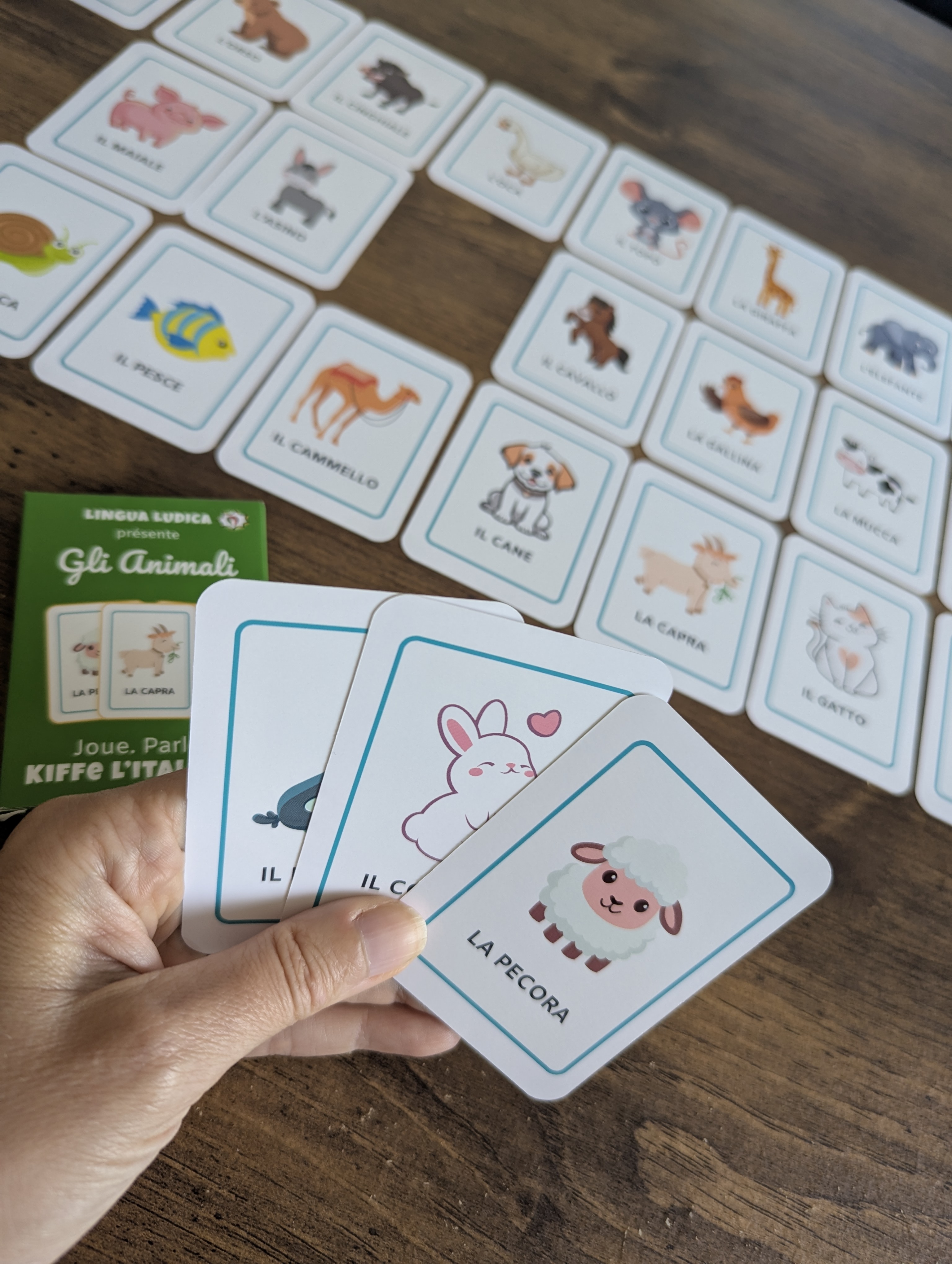 🐕🐐🐒🦆🐇🐫🐄 Chaque carte présente au recto l'animal illustré et au verso l'animal + le nom en italien pour booster ta mémoire visuelle